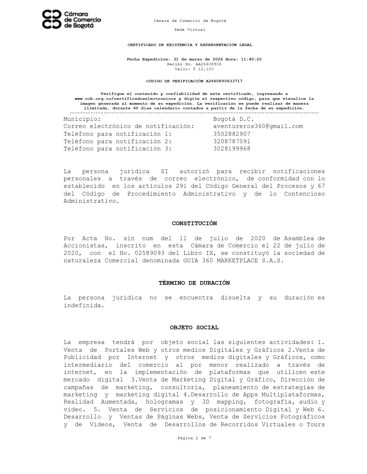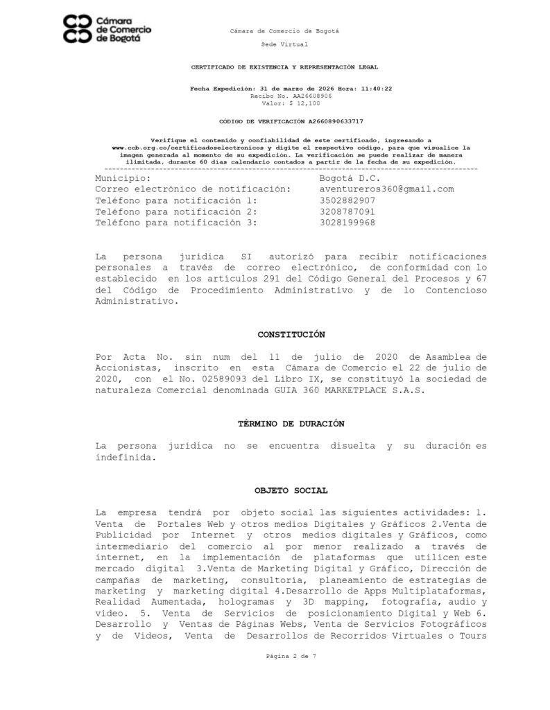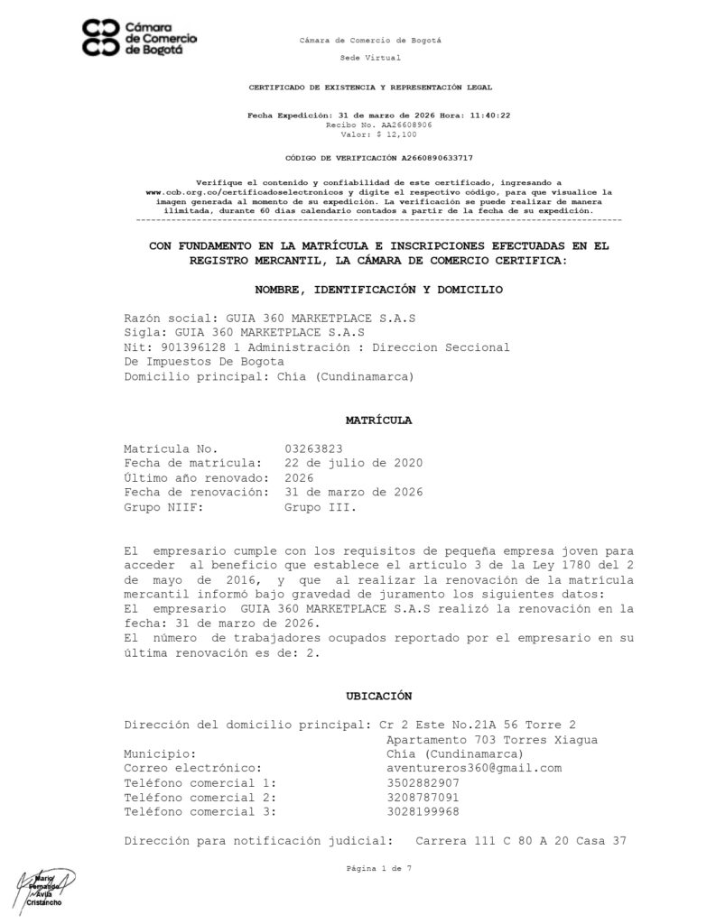 Empresa legalmente constituida como Guía 360 Marketplace S.A.S.